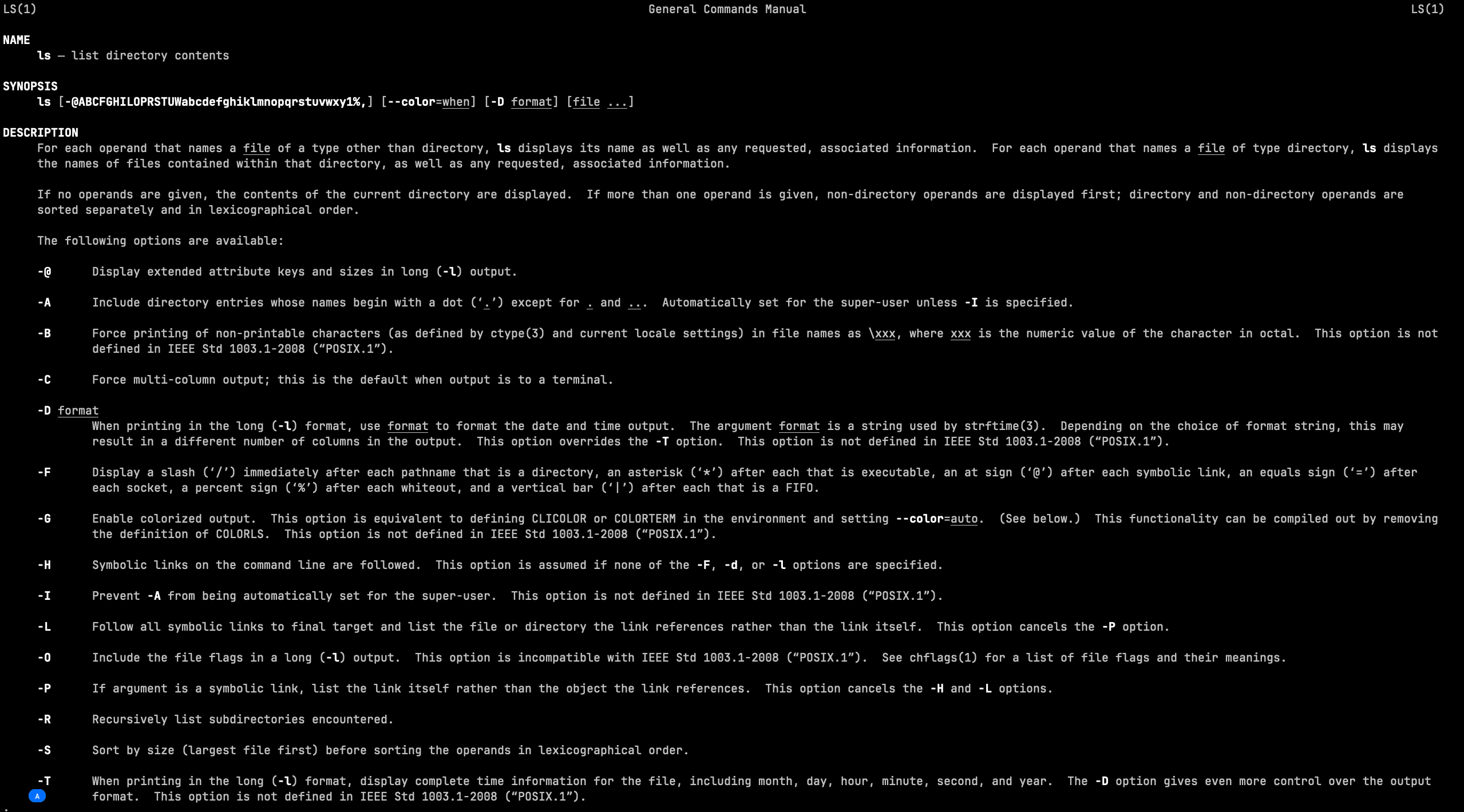 通过 man ls 可以看到 ls 还有很多功能及参数选项等, 不再一一列举: